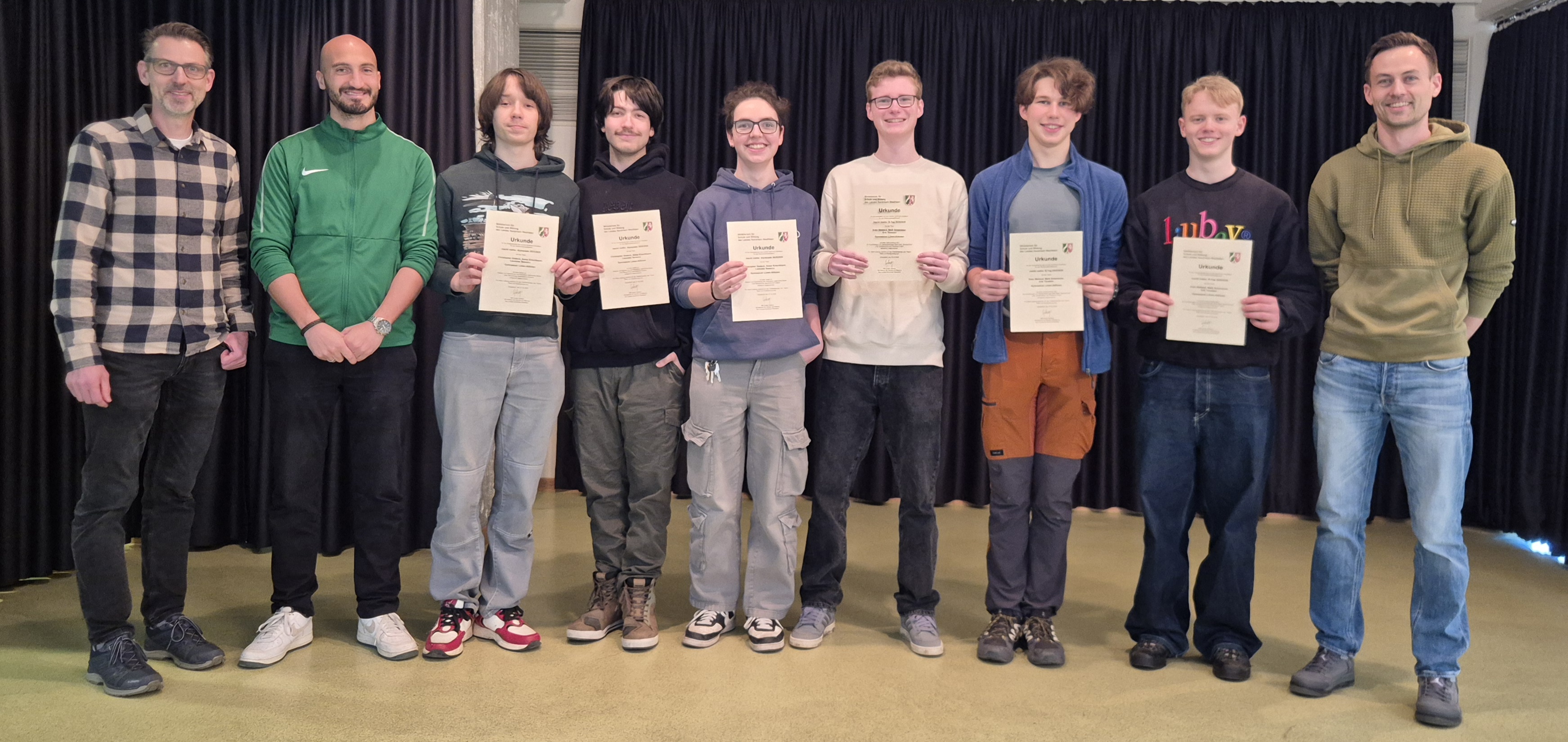 Zum internationalen Mathematikwettbewerb 'macht mathe' haben die Schüler der Einführungs- und Qalifikationsphase am Gymnasium Altlünen durch Herrn Rausch-Holtermann ihre Urkunden verliehen bekommen. Der stellvertretende Schulleiter hob die intensive, eigenständige Auseinandersetzung mit der Mathematik über den Unterricht hervor und gratulierte zur erfolgreichen Beteiligung an der Landesrunde. Während eine Gruppe die Fahrpläne von elektrischen Bussen optimierte, nahm sich die zweite Gruppe die Fibonacci-Folge zur Hilfe, um die Auswrikungen von Startaufstellungen beim Spiel 'Bocksprünge' zu untersuchen.